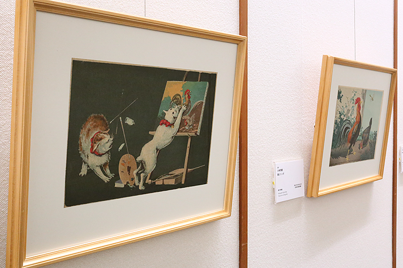 (左から)小林清親《カンバスに猫》 / 小林清親《鶏にトンボ》
