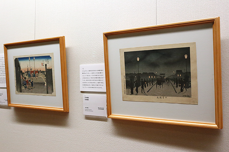 文明開化に沸く都市の姿を「光線画」で表現した小林清親(1847~1915)と、幕末の風景を抒情豊かに描いて西欧でも称賛された歌川広重(1797~1858)。風景画をはじめ戯画・花鳥画まで、ふたりの代表作が並びます。