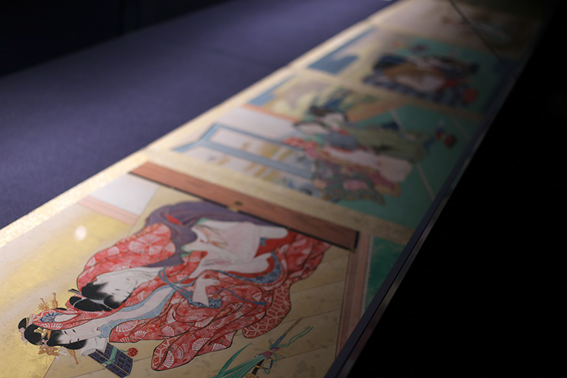 岡田美術館では、少し奥まった展示室で紹介。現在は、格調高い画風で狩野派による作と思われる《春画絵巻》、12カ月の季節の中に男女の交わりを描いた渓斎英泉《十二ヶ月風俗画帖》、そして春画史上に残る最高傑作のひとつともいわれる葛飾北斎《浪千鳥》を展示しています。ウェブで詳細はご紹介できませんので、ぜひ美術館でご覧ください。