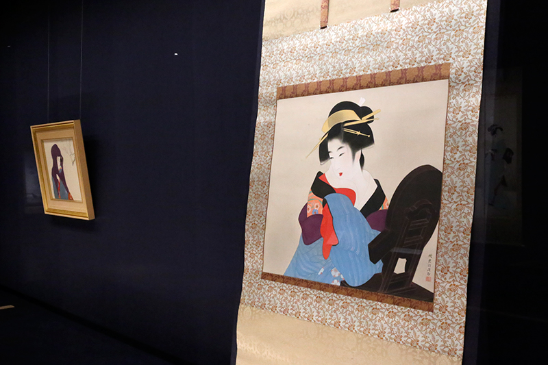 「西の松園、東の清方」と並び称された美人画の名手、上村松園と鏑木清方を向かい合わせで紹介。清方の隣には弟子の伊東深水で、深水の《三千歳》と《早春》は近ごろ