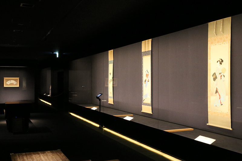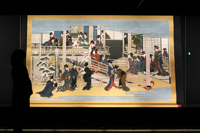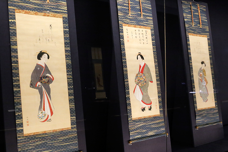 江戸時代の美人画の多くは、遊女や芸者を描いたもの。円山応挙、葛飾北斎、そして喜多川歌麿ら、東西の肉筆浮世絵が並びます。