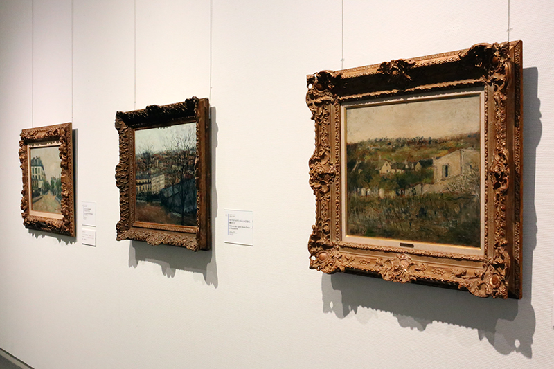(左から)モーリス・ユトリロ《モンマニーの3本の通り(ヴァル=ドワーズ県)》 / モーリス・ユトリロ《モンマルトルのサン=ピエール広場から眺めたパリ》 / モーリス・ユトリロ《ピエールフィットの風景》