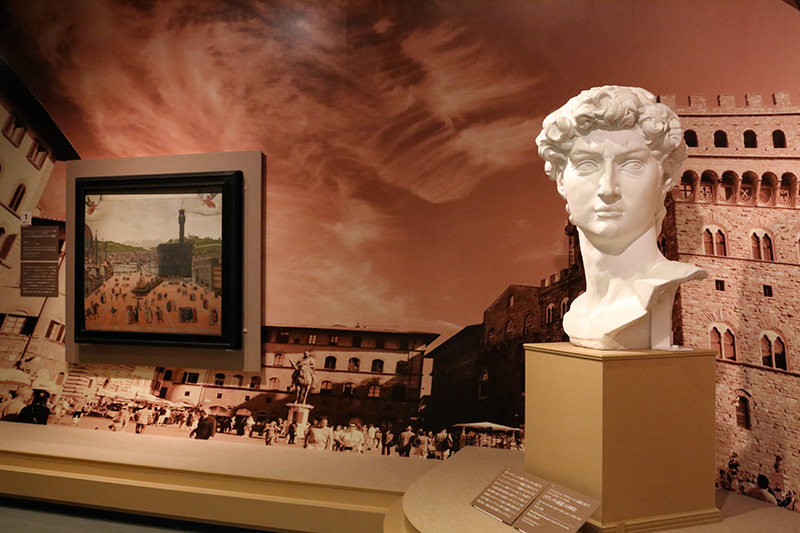 (左から)フランチェスコ・ディ・ロレンツォ・ロッセッリに帰属《シニョリーア広場におけるサヴォナローラの処刑》 / ミケランジェロ・ブオナローティの原作に基づく《ダヴィデの頭部(石膏模造)》