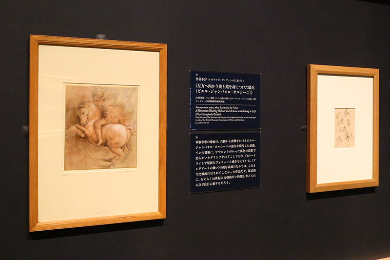 (左から)作者不詳(レオナルド・ダ・ヴィンチに基づく)《左方へ向かう兜と鎧を身につけた騎兵(ピエル・ジャンパオロ・オルシーニ)》 / レオナルド・ダ・ヴィンチ(派)《戦う騎兵の習作》