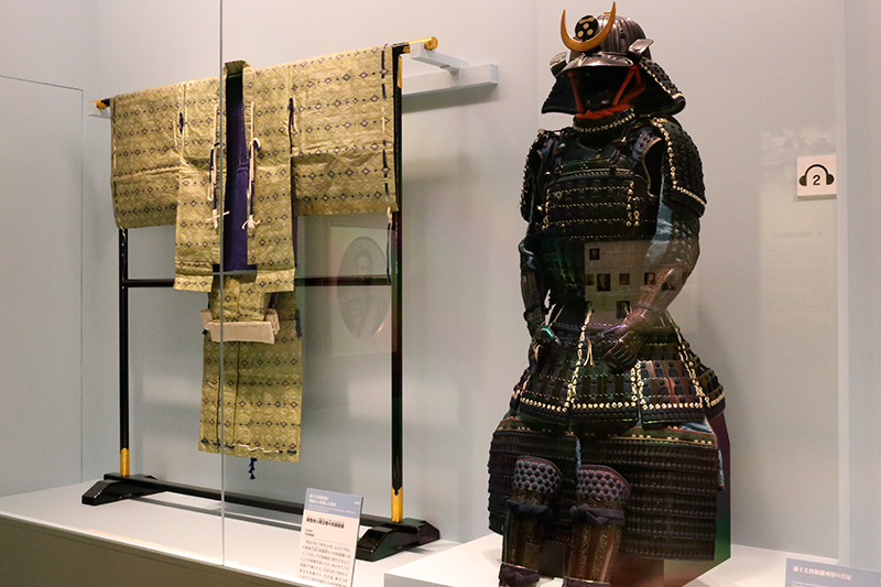 (左から)《萌葱地小葵文様大和錦直垂》 / 《紺糸威具足[ 胴:銘 明珍信家 兜:銘 明珍貞家 ]》 ともに毛利博物館