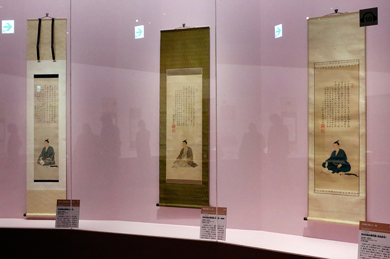 (左から)《吉田松陰自賛肖像(久坂本)》松陰神社(東京都) / 《吉田松陰自賛肖像(杉家本)[ 複製 ]》松陰神社(山口県) / 《吉田松陰自賛肖像(吉田家本)》山口県文書館