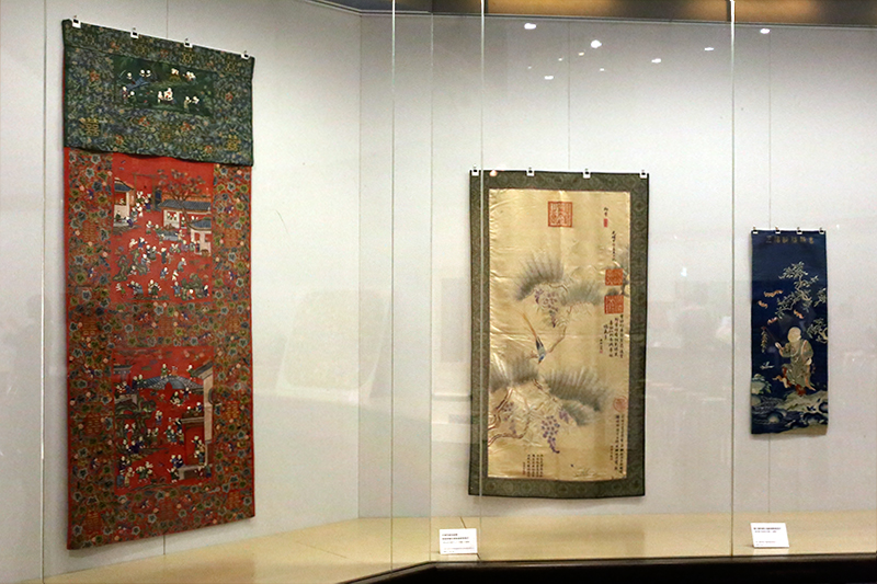 (左から)《紅紗地納紗綉百子図門簾》(百子図を刺繍した入口の垂幕) / 《牙黄色緞地絨綉慈禧御筆松樹紫藤綬帯鳥図片》(西太后の画をもとに刺繍した織物) / 《藍江綢地綉五福齢椿報喜図片》(福を願う図柄を刺繍した織物)