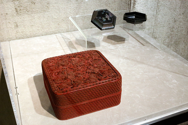 (手前)《龍紋剔紅方盒》(龍紋の漆の蓋物) / (奥)《嵌螺鈿人物紋黒漆盒》(螺鈿の人物紋の蓋物)