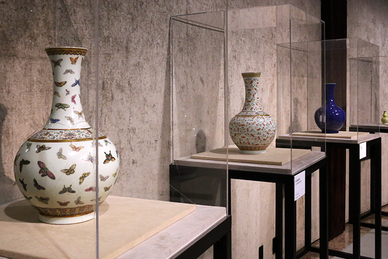 (左から)《粉彩百蝶紋賞瓶》(粉彩の百蝶紋の鑑賞用瓶) / 《粉彩雲蝠紋賞瓶》(粉彩の雲蝠紋の鑑賞用瓶) / 《藍釉賞瓶》(藍釉の鑑賞用瓶)