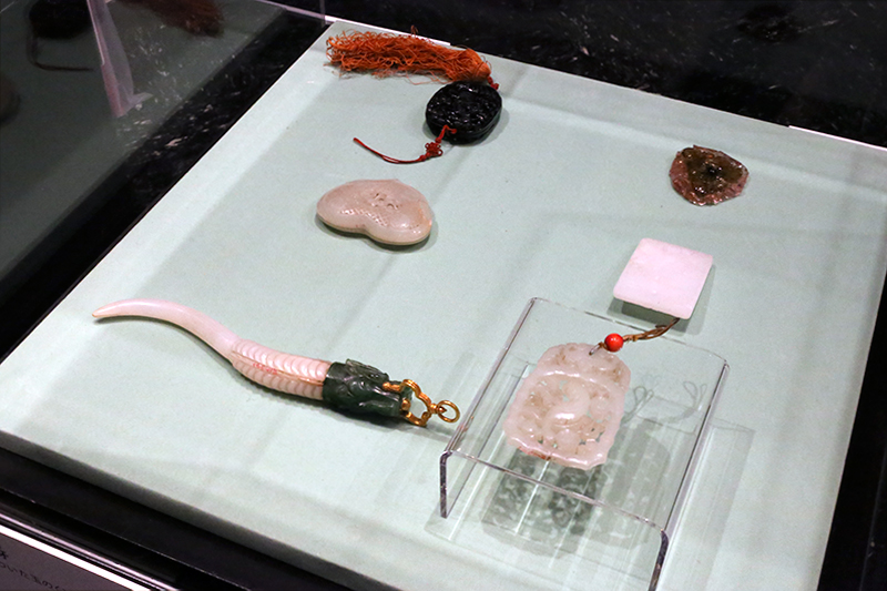 (左下から反時計回り)《玉龍首觿牙》(龍の首がついた玉のくじり) / 《玉鏤雕鸚鵡紋佩》(鸚鵡を透かし彫りした玉佩) / 《玉仙人乗槎紋佩》(仙人の図柄の玉佩) / 《碧璽松鼠葡萄紋佩》(葡萄に栗鼠模様の佩) / 《琥珀人物紋香嚢》(人物紋の琥珀の匂い袋) / 《玉鏤雕寿字花卉紋香嚢》(透かし彫りの玉の匂い袋)