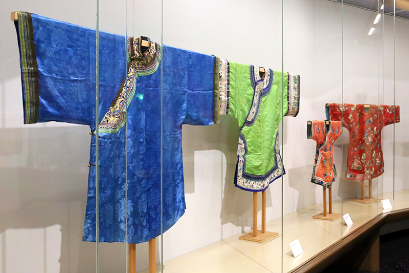 (左から)《湖藍花果紋暗花縐綢女衫》(花果紋の縮緬の女性用上着) / 《葱緑百蝠紋暗花綢女衫》(蝙蝠紋の女性用上着) / 《桃紅色暗花縐綢三藍綉花蝶福寿紋女襖》(花蝶福寿紋の刺繍入り女性用上着) / 《紅緞地綉富貴三多紋女襖》(三多紋の刺繍入り女性用上着)