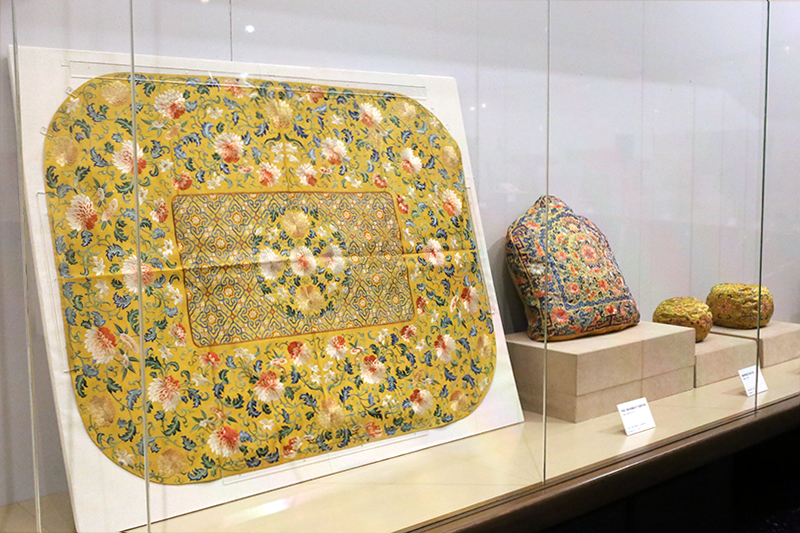 (左から)《明黄緞綉四合菊花文墊套》(菊花紋の座布団) / 《明黄江綢地綉纏枝花万福靠背套》(椅子の背もたれカバー) / 《黄緞綉蕃蓮万福迎手套》(脇息の一種)※2点とも