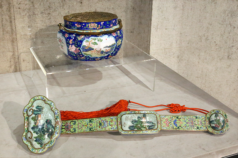 (手前)《粉彩開光海屋添籌図如意》(粉彩の長寿を願う紋様の如意) / (奥)《銅胎画琺瑯 "三陽開泰" 図手炉》(三陽開泰図の七宝の手あぶり)