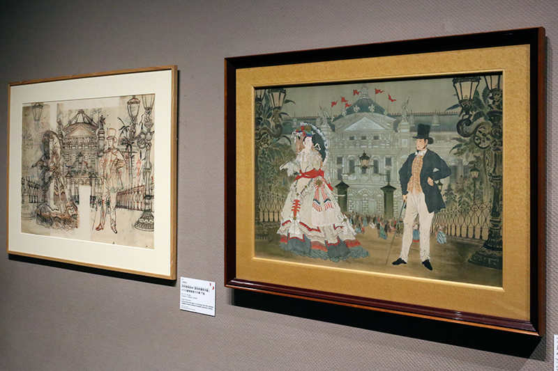 (左から)河鍋暁斎《河竹黙阿弥作「漂流奇譚西洋劇」パリス劇場表掛りの場 下絵》 / 河鍋暁斎《河竹黙阿弥作「漂流奇譚西洋劇」パリス劇場表掛りの場》