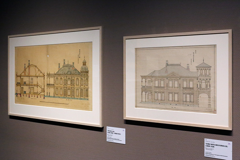 (左から)ジョサイア・コンドル《「茅町邸宅之図」立面図(東面)、断面図(南北)》 / ジョサイア・コンドル《「岩氏駿河台御住宅新築之図」立面図(北面)》