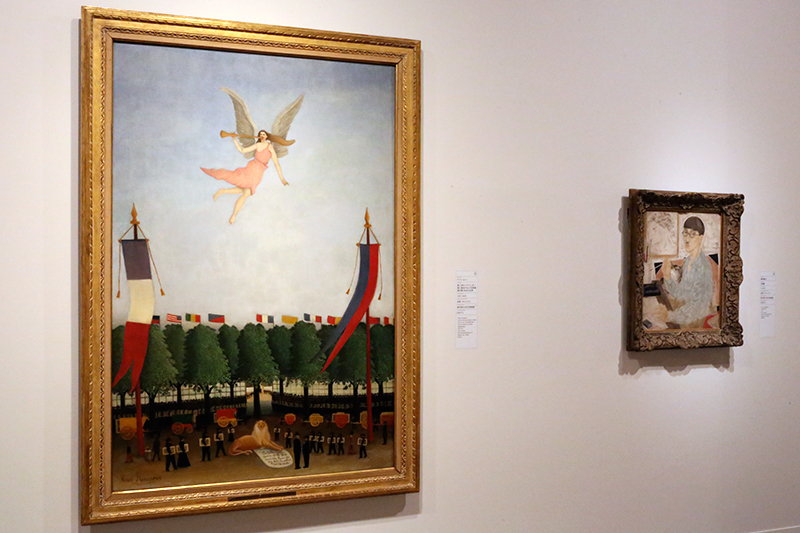 (左から)アンリ・ルソー《第22回アンデパンダン展に参加するよう芸術家達を導く自由の女神》東京国立近代美術館 / 藤田嗣治《自画像》東京国立近代美術館