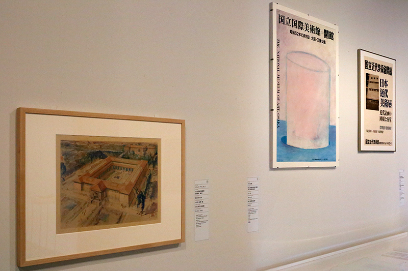 (左から)フランク・ブラングイン《共楽美術館構想俯瞰図、東京》国立西洋美術館 / 早川良雄《国立国際美術館 開館》国立国際美術館 / 原弘《日本近代美術展:近代絵画の回顧と展望》東京国立近代美術館工芸館