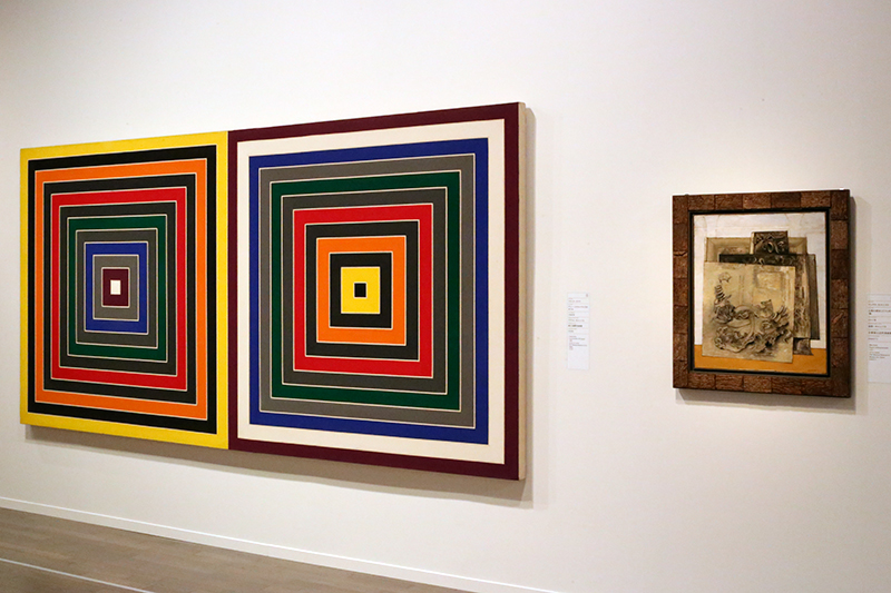 (左から)フランク・ステラ《グレー・スクランブルⅫダブル》国立国際美術館 / マックス・エルンスト《人形の形をしたフィギュア(像)》京都国立近代美術館