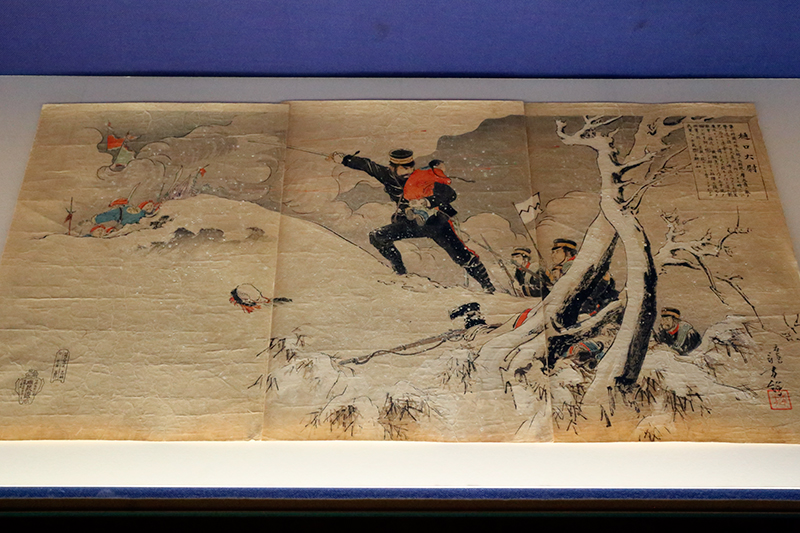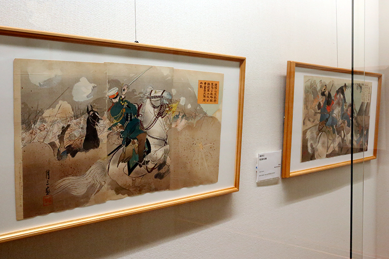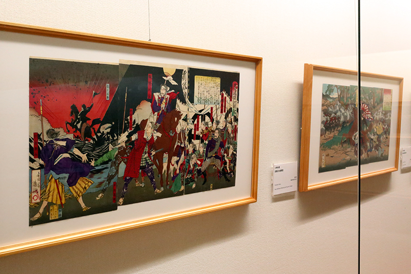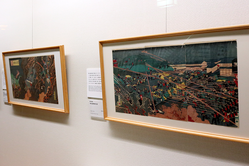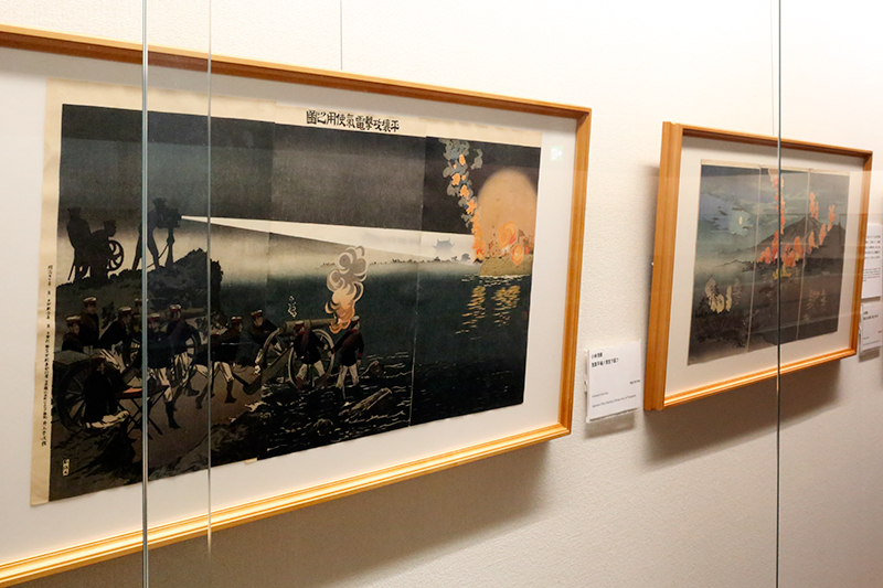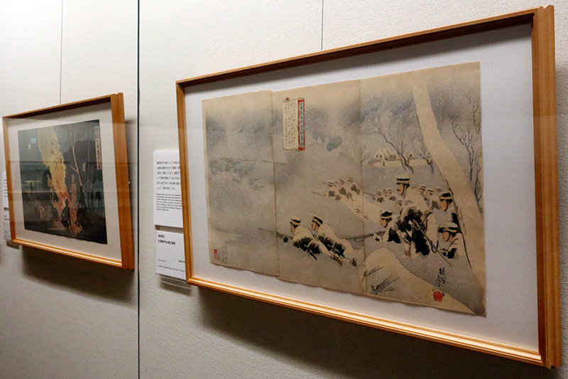 (左から)田口米作《奉天府遠望 日軍露営之図》 / 楊洲周延《日清戦争守永中尉之奮戦》