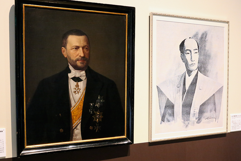 (左から)《フリードリッヒ・アルブレヒト・ツー・オイレンブルク伯爵像》個人蔵 / 《老中安藤信正像》個人蔵
