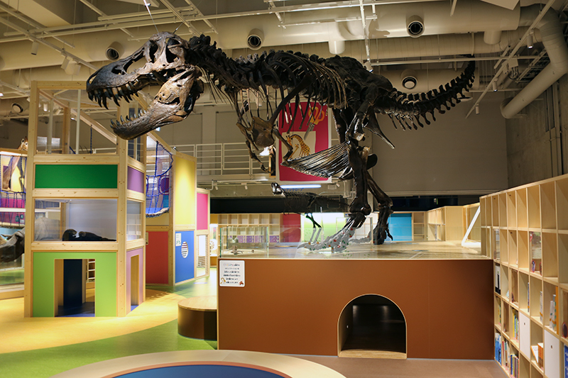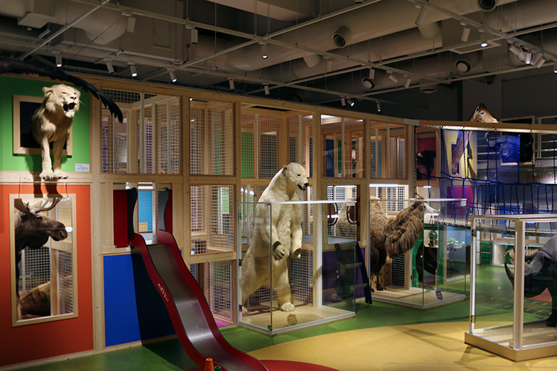 靴を脱いで上がる室内には、大型遊具のような設備とともに動物の剥製や恐竜の化石を配置。トンネルをくぐったり、吊り橋をわたったりと、身体を動かす中で、トドは真上から、ティラノサウルスは真下からと、普通の展示室では見る事ができない角度から観察する事ができます。