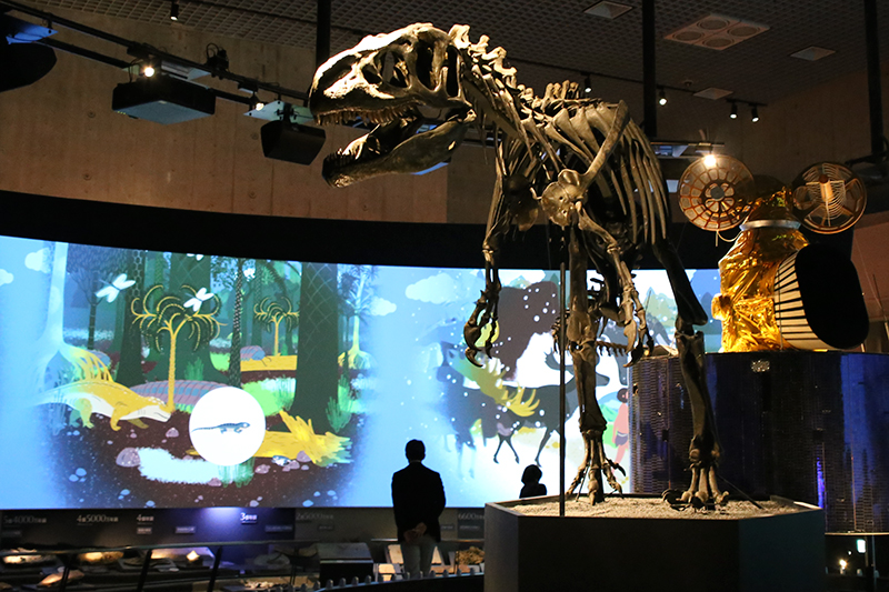 まず地球館の入口にあたる1階には、シンボルゾーン「地球史ナビゲーター」が設けられました。宇宙誕生から現在に至るまでの長い歩みを「宇宙史」「生命史」「人間史」の3つの切り口で紹介し、この場所で地球館全体を俯瞰してもらおうという試みです。