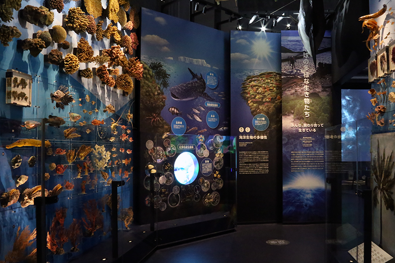 奥に通じるエリアの「海上生物の多様性」、1階展示の最後にあたる「生物多様性の保全」も新しくなりました。