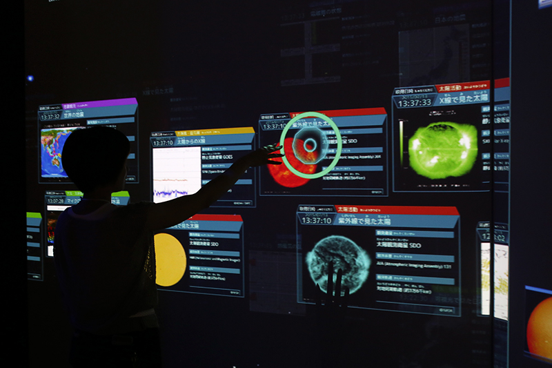 2階の導入部分には、人工衛星から観測した地球に関するさまざまの情報(温度、水蒸気量、地磁気の変動など)が、準リアルタイムで更新される「観測ステーション」も設置。スクリーンに手をかざす事で映像を操作するのは、まるで映画「マイノリティー・リポート」のよう。ちょっといい気分を味わえます。