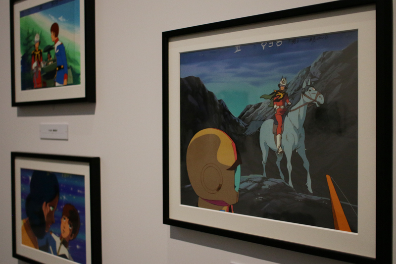 天井のアイカットビジュアルが印象的な展示室には、なんと原画が約500枚も!印象的なセリフとともに並ぶ、名シーンの数々。安彦良和氏の手によって描かれた、生き生きとしたキャラクターたちをお楽しみください。