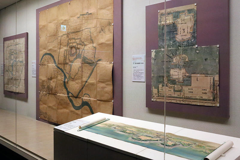 (左から)《北之庄城郭図》(福井城)松平文庫 福井県立図書館保管 / 《御城下之図》(福井城)松平文庫 福井県立図書館保管 / 滋賀県立指定有形文化財《覚 膳所城修覆願ケ所絵図》(膳所城)滋賀県立図書館蔵 / (右手前)疋田春湖・画《石鹿城図巻》(膳所城)大津市歴史博物館蔵