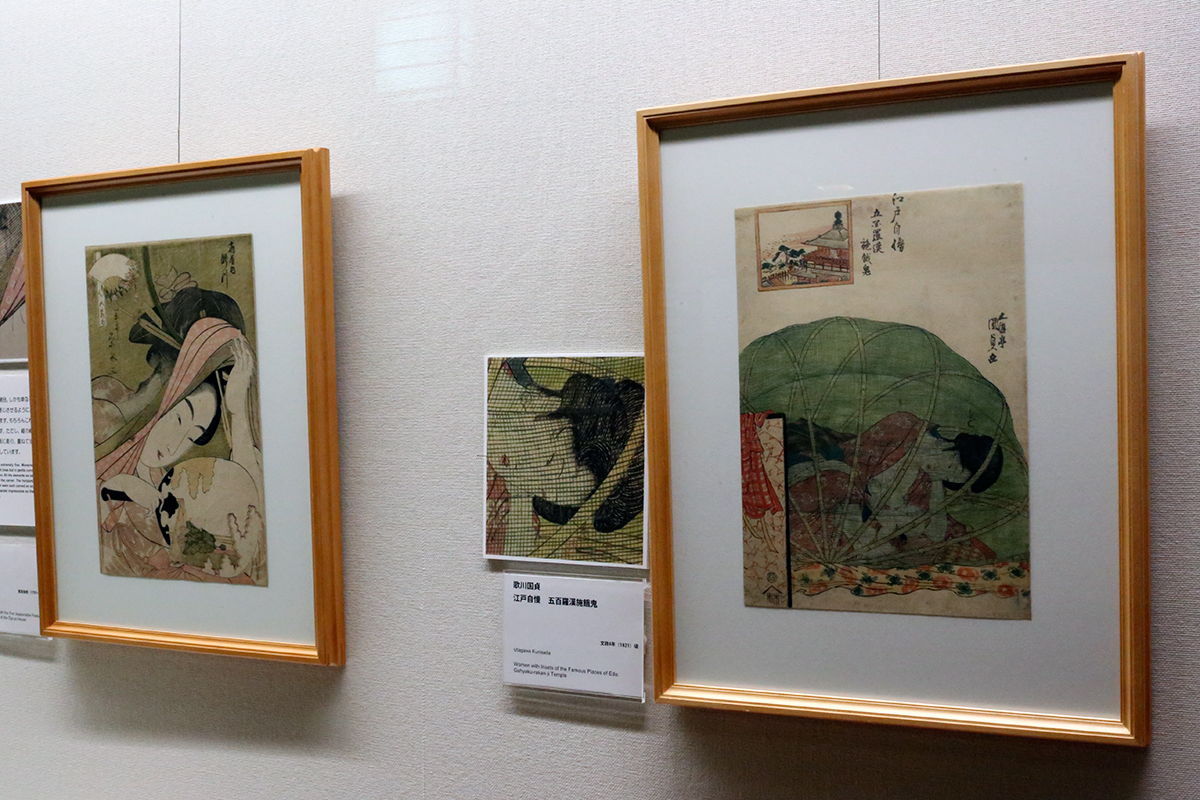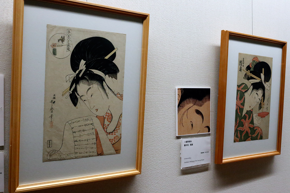 (左から)喜多川歌麿《五人美人愛敬競 兵庫屋花妻》 / 一楽亭栄水《鶴や内 陸奥》