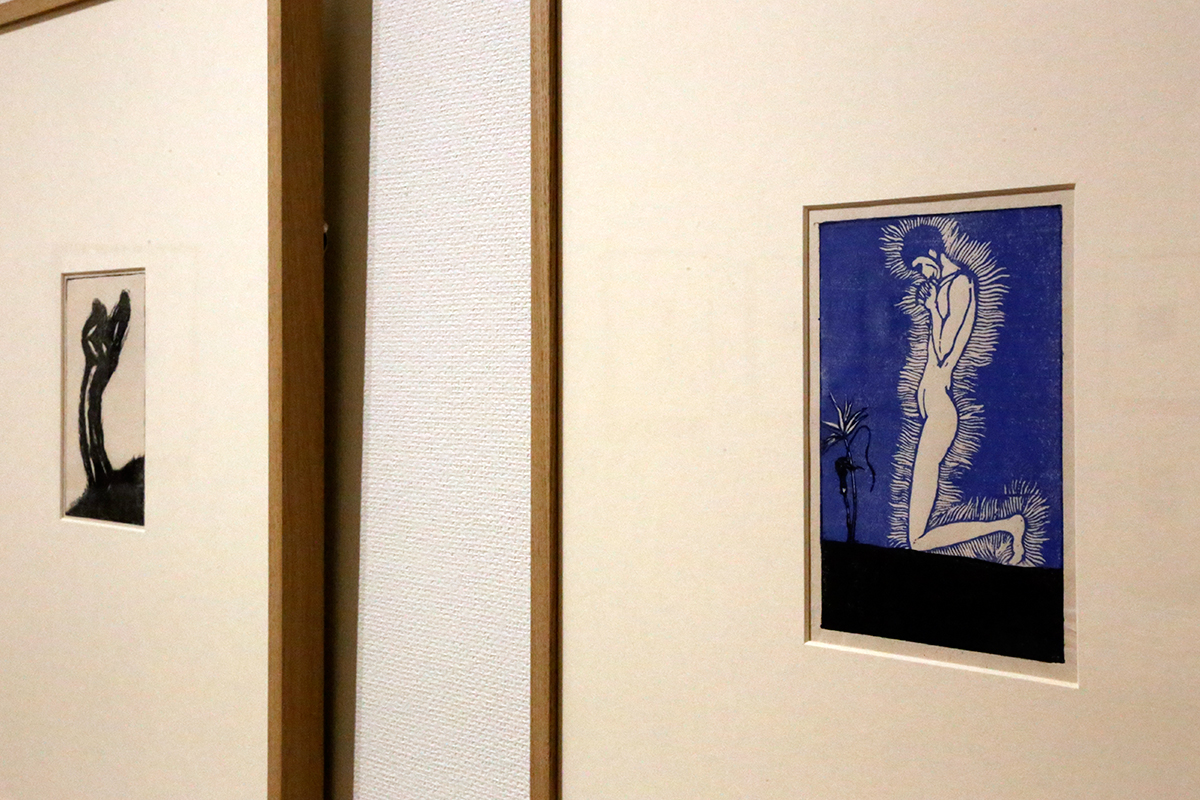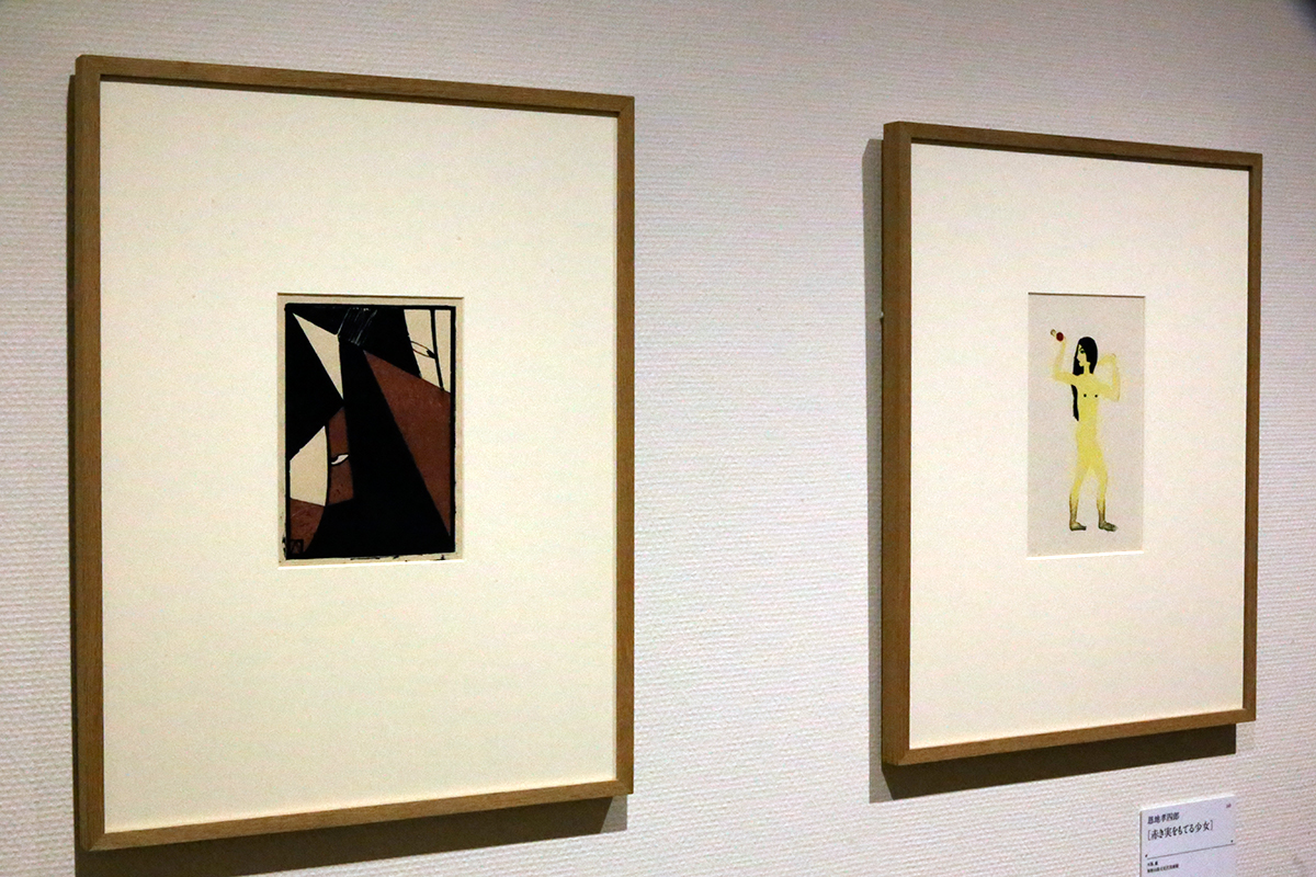 (左から)恩地孝四郎《よりそふもの》(私輯『月映』Ⅳ うつそみ) / 恩地孝四郎《赤き実をもてる少女》 いずれも和歌山県立近代美術館