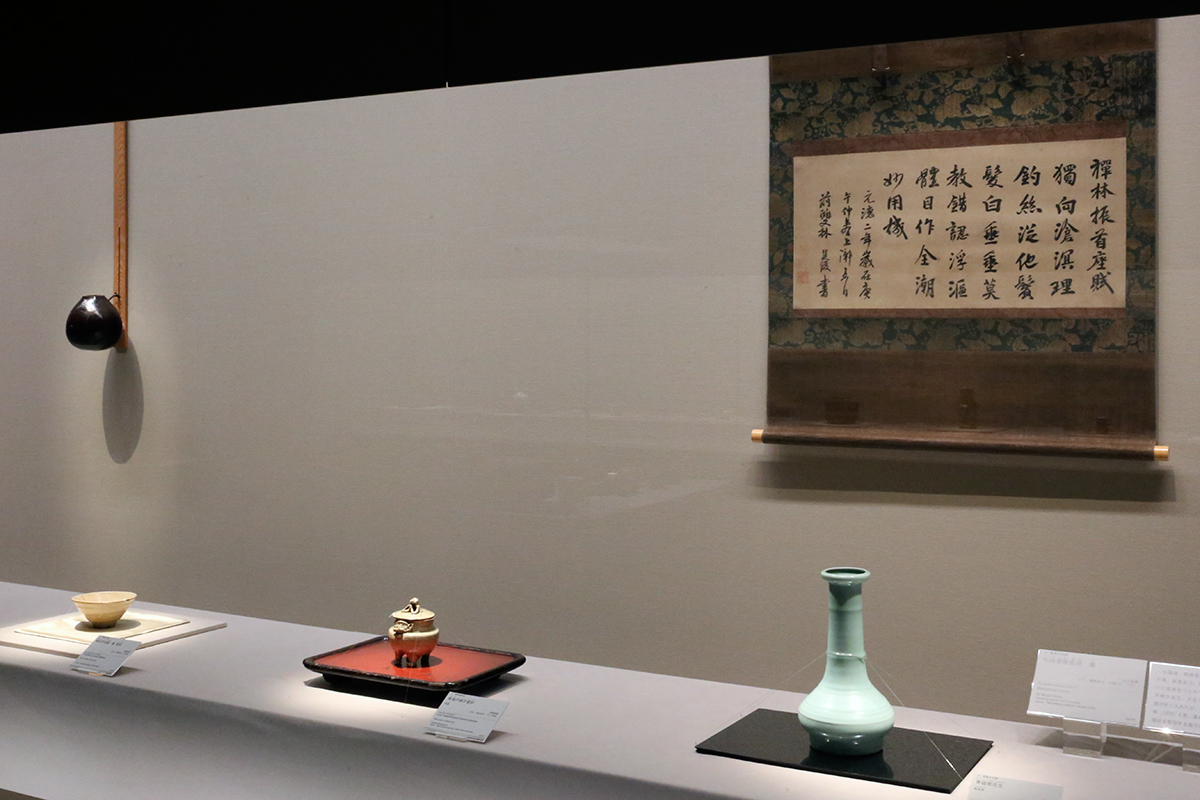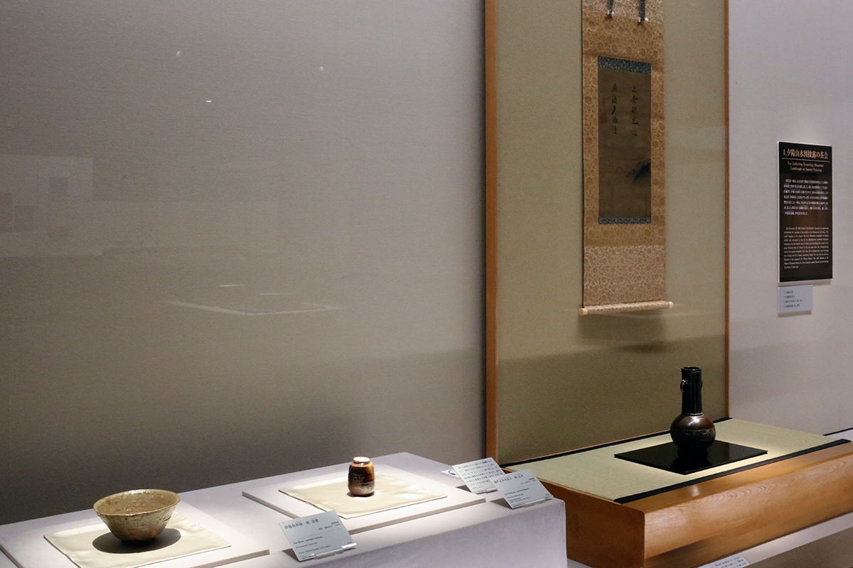 (左から)《伊羅保茶碗 銘 淀屋》 / 《瀬戸正木手茶入 銘 正木》 / 重要文化財《夕陽山水図》馬麟筆・理宗賛 / 《古銅象耳花生》