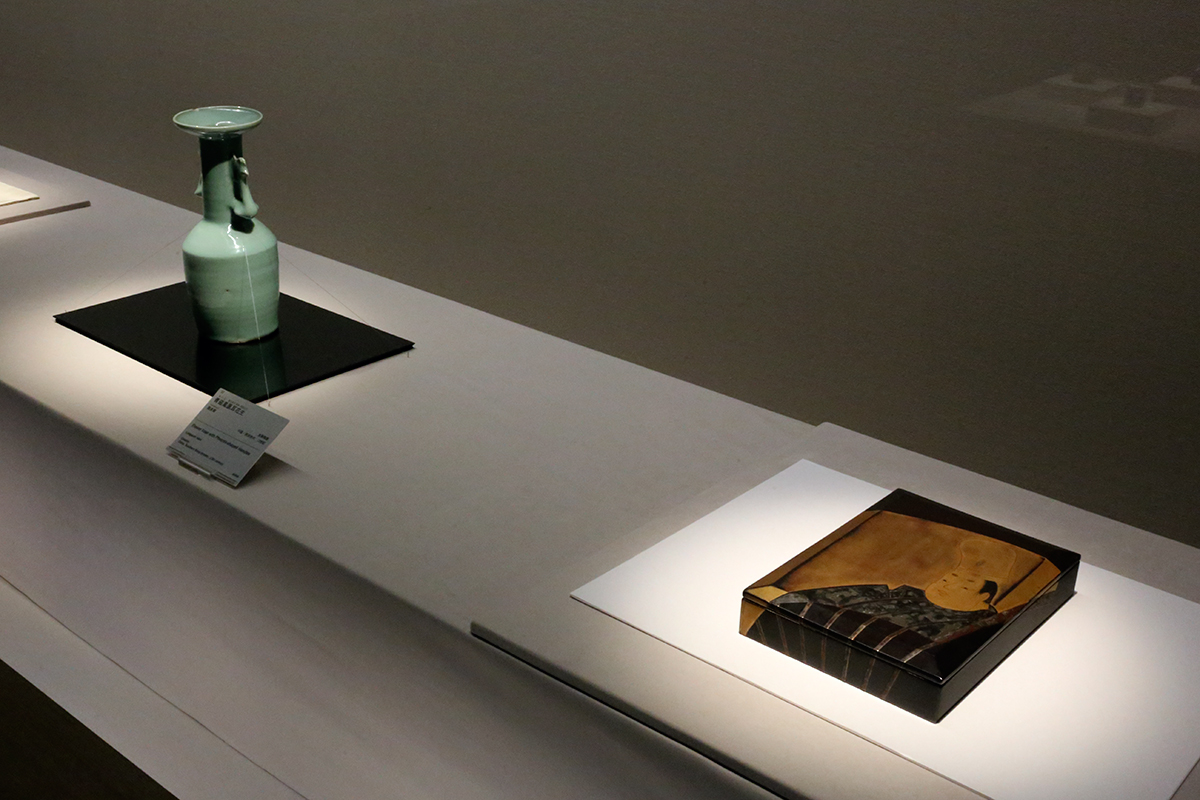 (左から)《青磁鳳凰耳花生》龍泉窯 / 《業平蒔絵硯箱》伝 尾形光琳作