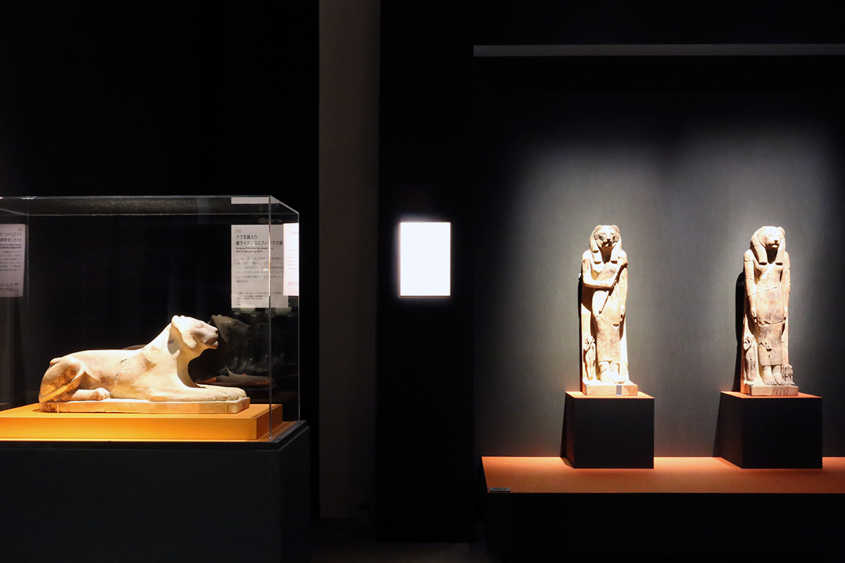 (左から)《クフ王銘入り雌ライオンのスフィンクス像》 / 《クフ王とペピ1世像を伴うライオン女神像》 / 《クフ王とペピ1世像を伴うライオン女神像》