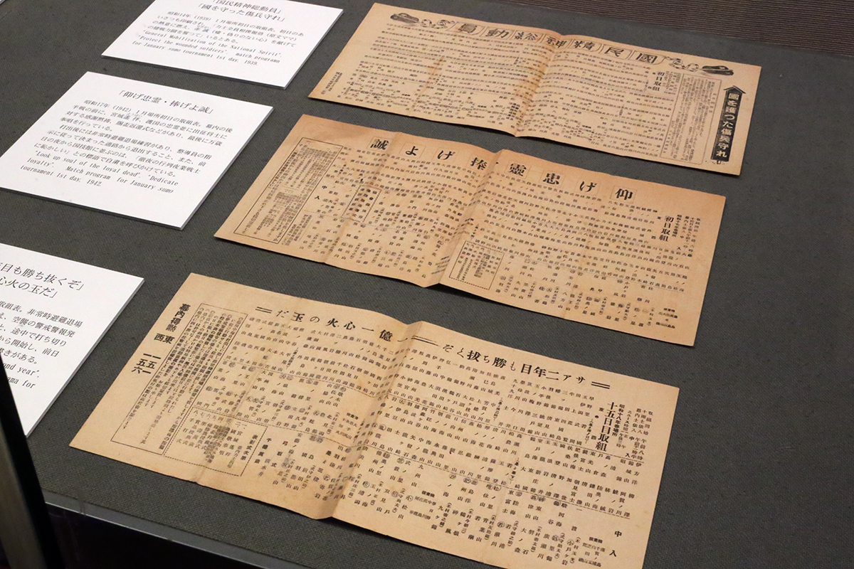 標語が書かれた取組表 (上から)「国民精神総動員」「國を守った傷兵守れ」(1939年1月場所) / 「仰げ忠霊・捧げよ誠」(1942年1月場所) / 「サア二年目も勝ち抜くぞ」「一億一心火の玉だ」(1943年1月場所)