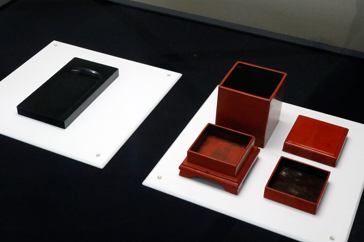 伝 小松天皇下賜・一休宗純所用《石硯》室町時代 酬恩庵蔵 / 伝 一休宗純所用《朱漆塗印箱》室町時代 酬恩庵蔵