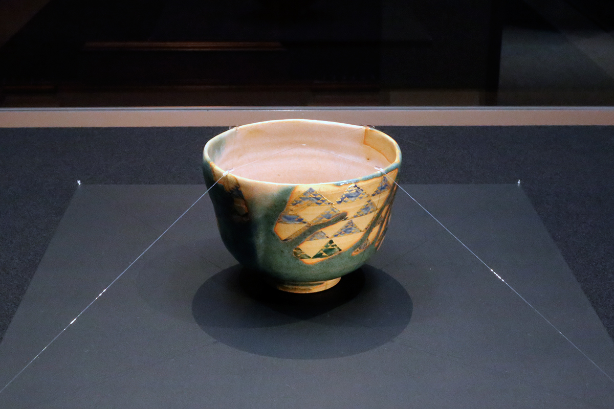 派手な文様が目を惹く茶碗も、かつて南三井家が所持し、現在は北村美術館蔵となった重要文化財《色絵鱗波文茶碗》。野々村仁清が加賀前田藩の注文を受けて作ったもので、仁清の色絵茶碗を代表する逸品です。
