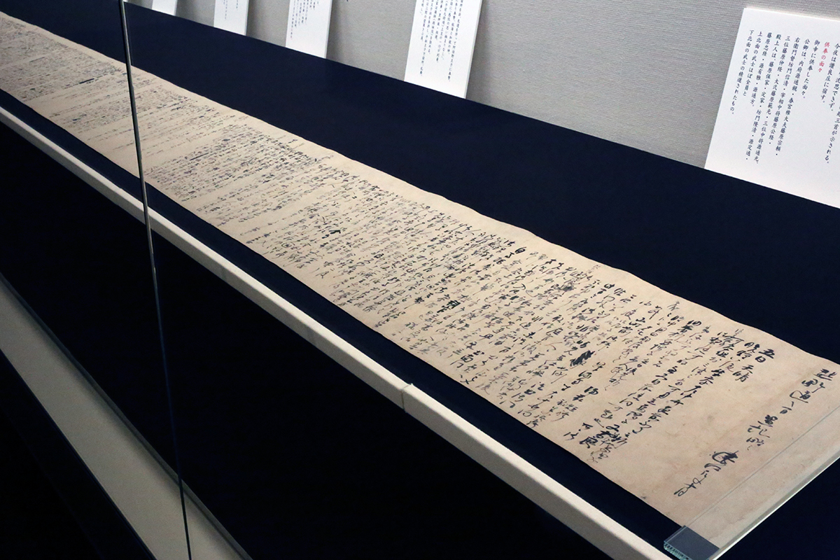 いつもは展示室4の奥が指定席ですが、今回は最後の展示室7。右側は能面、左側は刀剣と、武家文化の象徴に挟まれるように紹介されています。
