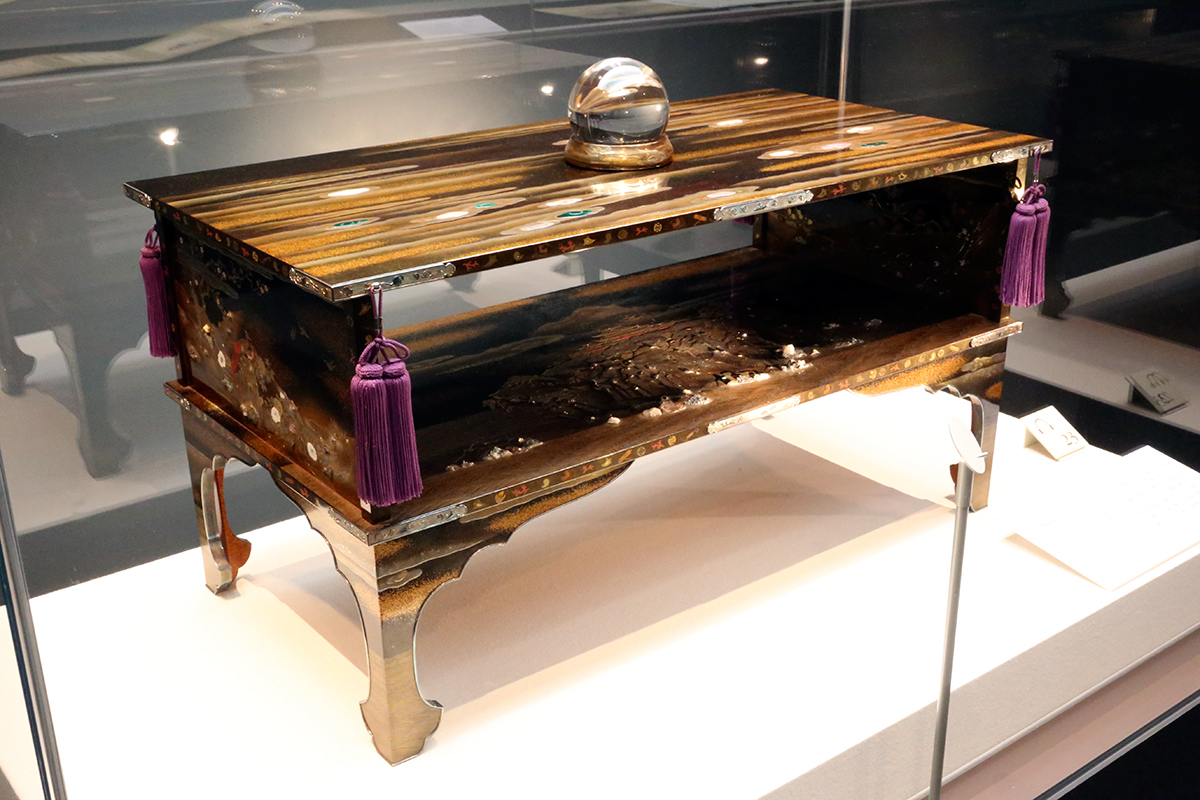 重要文化財《羊皮紙地図(日本航海図)》は、皮をうすくなめした羊皮紙に描かれた珍しい海図。《月宮殿蒔絵水晶台》は水晶玉を飾るために作られた台で、中板に楼閣「月宮殿」をあしらい、水晶を月に見立てています。