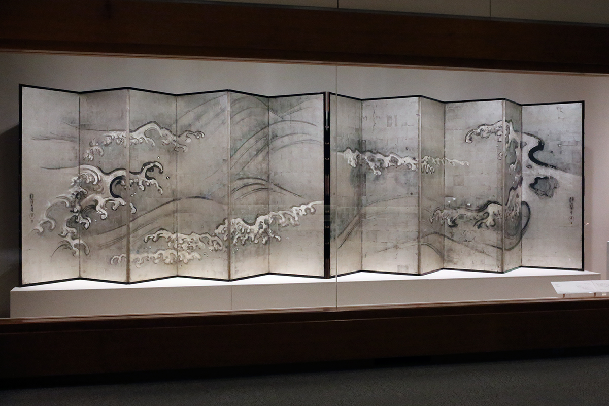 目立つ銀地の屏風は、抱一による《波図屏風》。光琳の《波濤図屏風》(メトロポリタン美術館蔵)から着想したと思われ、金地に描いた光琳に対し、抱一は月光をイメージした銀地に、ダイナミックな波を表現しました。