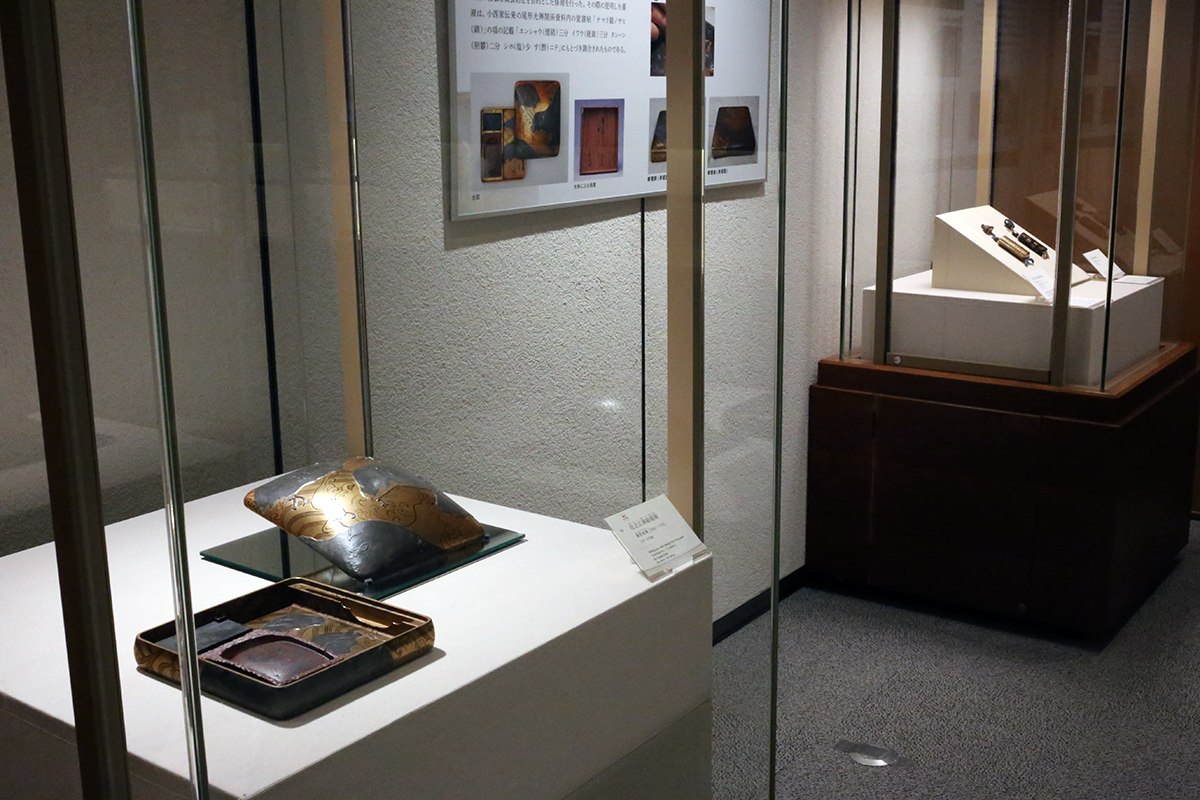 展示室の奥が、国宝 俵屋宗達《源氏物語関屋・澪標図屏風》修理後初お披露目のもうひとつは、尾形光琳による重要文化財《住之江蒔絵硯箱》。光琳が私淑する本阿弥光悦の硯箱を模して作ったもので、こちらは後期から展示がはじまりました。手本になったのは、東京国立博物館が所蔵する