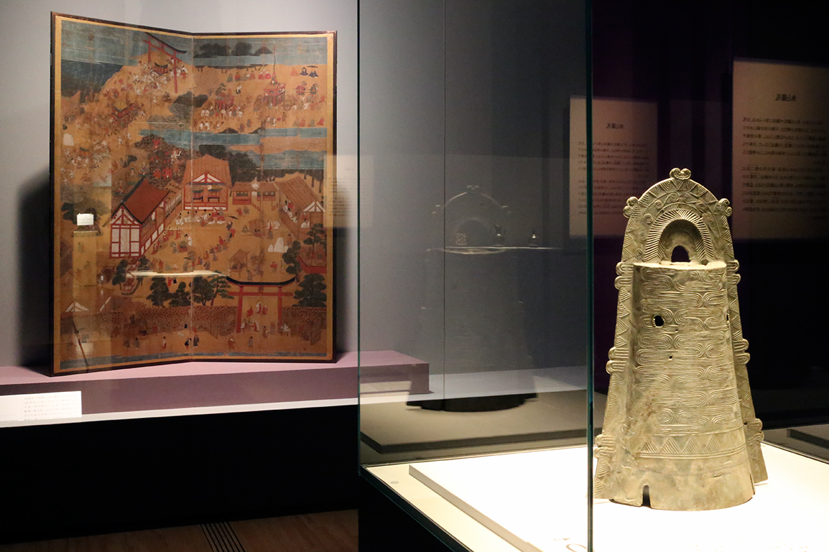 (左から)《祇園社大政所絵図》個人蔵 / 《流水文銅鐸》八尾市立歴史民俗資料館蔵