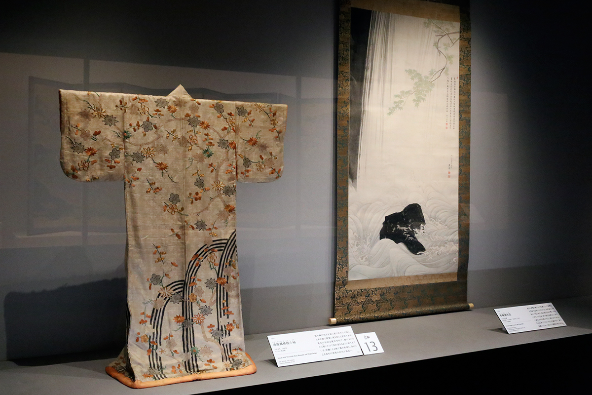 (左から)《滝梅楓模様小袖》サントリー美術館蔵 / 《青楓瀑布図》円山応挙筆 サントリー美術館蔵