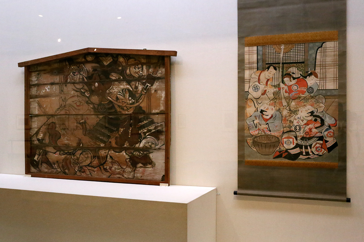 (左から)館山市指定文化財(無款)鳥居派《草摺曳図》那古寺蔵 / (無款)鳥居派《曽我狂言図》太田記念美術館蔵