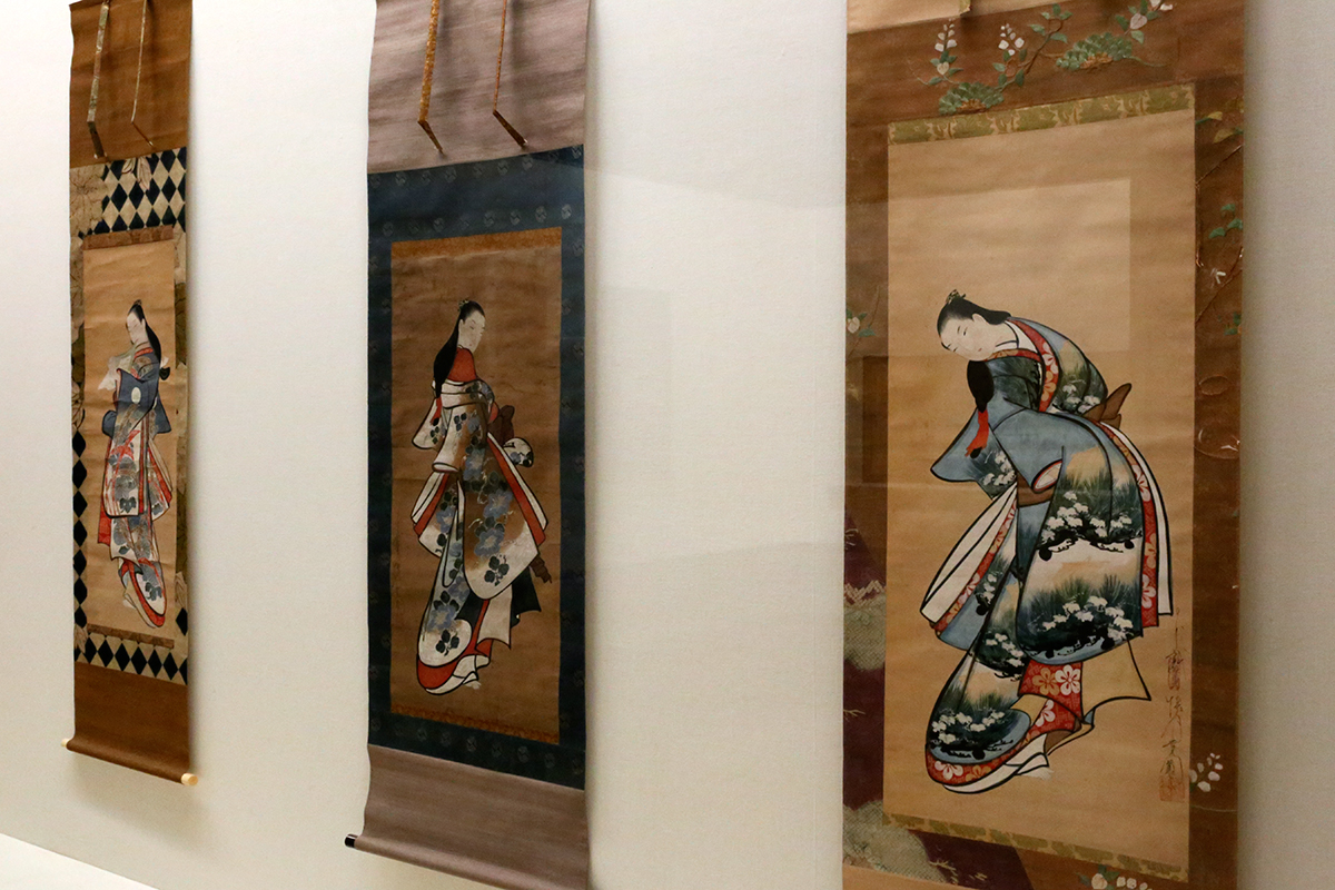 (左奥から)(無款)懐月堂派《立美人図》公益財団法人 摘水軒記念文化振興財団蔵 / 懐月堂安度《遊女立美人図》東京国立博物館蔵 / 懐月堂安度《立美人図》千葉市美術館蔵