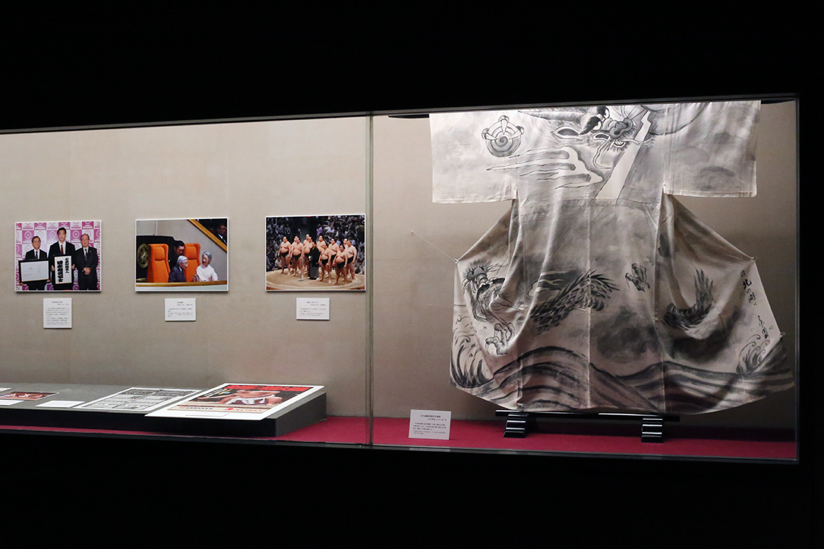 (右)《北の湖敏満使用の着物》 師匠の三保ケ関国秋(元大関・増位山大志郎)が龍を描いた