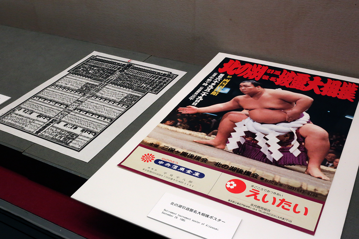 (左奥から)《1985年1月場所番付》 この場所の3日目で引退した / 《北の湖引退襲名大相撲ポスター》