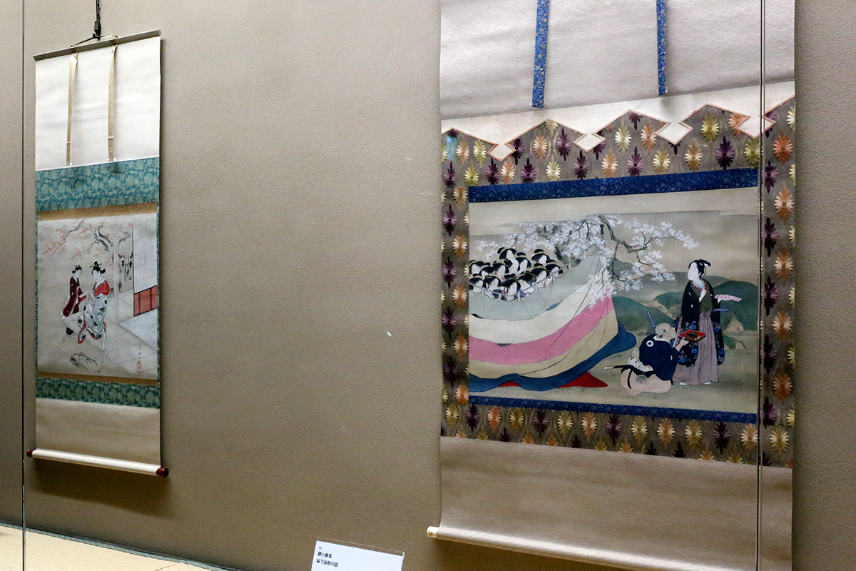 (左奥から)宮川春水《楓下詠歌の図》太田記念美術館 ※参考出品 / 勝川春章《桜下詠歌の図》太田記念美術館