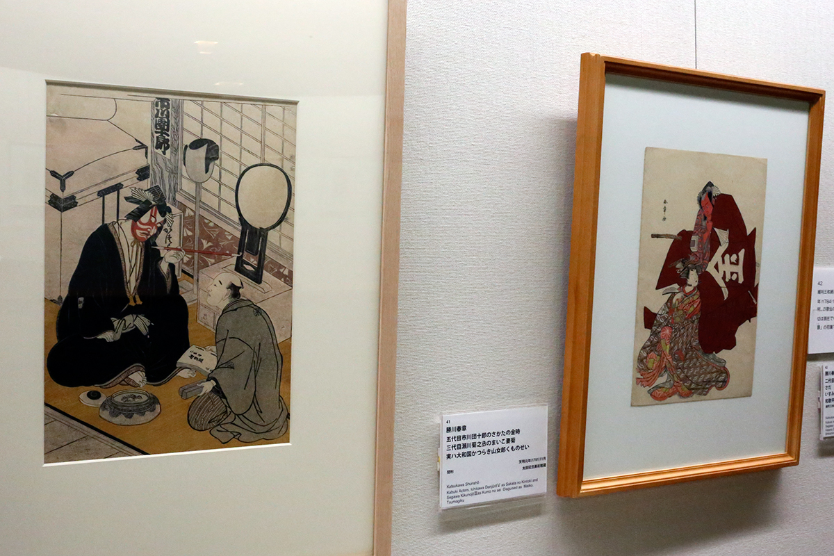 (左から)勝川春章《楽屋の五代目市川団十郎》東京国立博物館 / 勝川春章《五代目市川団十郎のさかたの金時 三代目瀬川菊之丞のまいこ妻菊実ハ大和国かつらき山女郎くものせい》太田記念美術館